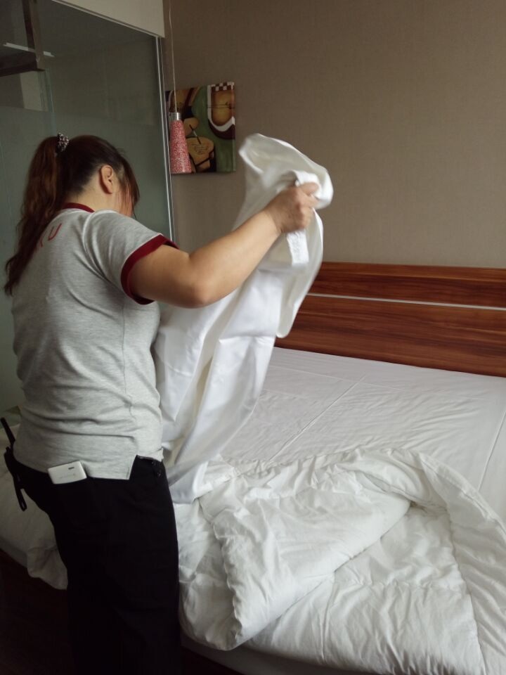 讲解结束后,冯店长把学生们分成了四组,一组学生在前厅学习PMS前台管理系统、对客服务流程等:另外三组学生分别由三位客房服务员带领在客房学习做床,保洁等工作。酒店的专业人员首先为学生演示操作流程,然后让学生们练习做床的步骤,酒店的专业人员从旁指导,使学生的实操能力增强,把书本上学到的理论知识应用到了实践中,实现了学校课程和酒店岗位的全面融合。