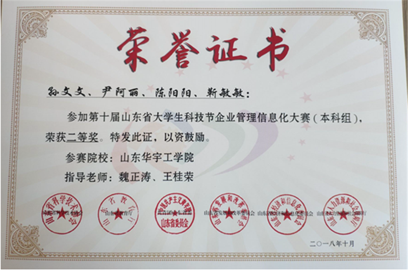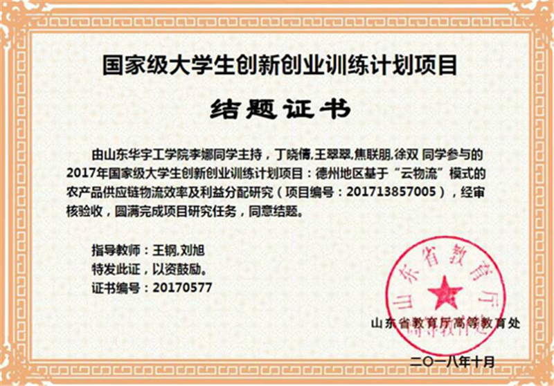 物流工程专业学生在2017年和2018年主持多项国家级大学生创新创业训练项目,并发表多篇学术论文,在第十届山东省大学生科技节企业管理信息化大赛(本科组),荣获二等奖, 在2017、2018年全国大学生英语竞赛和外研社杯全国英语阅读大赛上,物流工程专业多名学生获得特等奖和一等奖,在2017、2018年全国大学生数学建模大赛上,多名学生分别获得二等奖和三等奖。