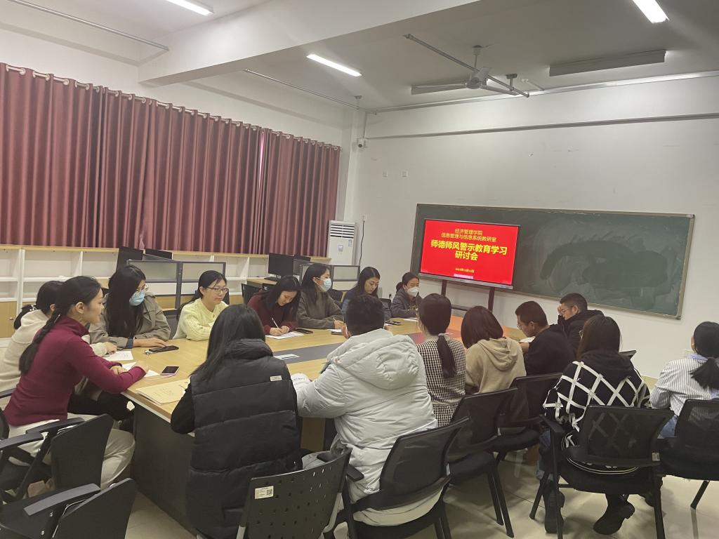 为深入贯彻落实习近平总书记关于教育的重要指示批示精神,不断加强我校师德师风建设,以案示警、以案促改,切实加强教师队伍建设,全面提高教师职业道德水平和素养,引导全体教师自觉增强立德树人、教书育人的荣誉感和责任感,根据《山东省教育厅关于开展师德教育系列活动的通知》、《山东华宇工学院关于开展师德师风警示教育活动的通知》等文件要求,信息管理与信息系统教研室按照学院部署,系统学习,开展了一系列活动。