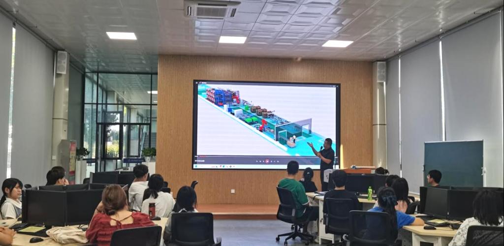 在智慧物流规划与决策中心,来自我校物流工程、工业工程、数字经济、财务管理、信息管理与信息系统专业的45名在校大学生认真聆听了物流工程专业负责人王钢老师的精彩讲座,成功引起大家对智慧物流科技的强烈好奇。