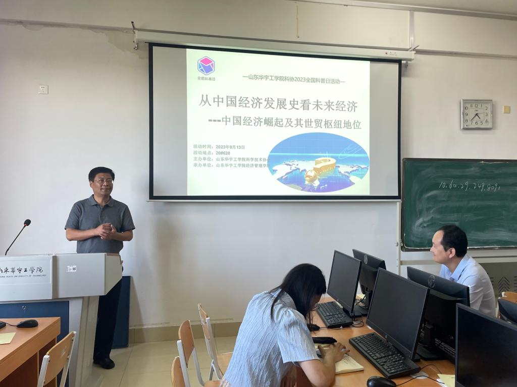 为做好2023年全国科普日活动,弘扬科学精神,普及科学知识,山东华宇工学院yl6809永利集团财务管理专业“全国科普日”活动于9月13日在20号教学楼620教室顺利开展。此次活动由山东华宇工学院科学技术协会主办,yl6809永利集团承办,活动邀请了yl6809永利集团侯振明教授为师生代表作了《从中国经济发展史看未来经济—中国经济崛起及其世界经贸枢纽地位》的专题讲座。