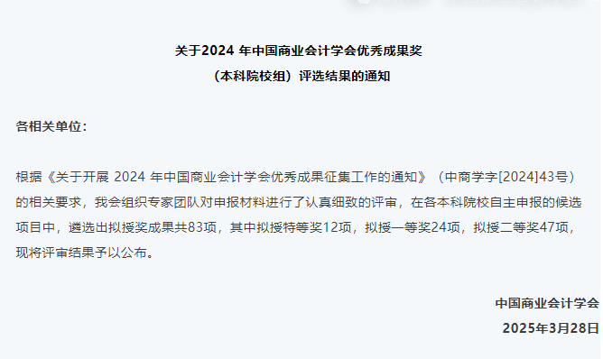 近日,在中国商业会计学会举办的2024年本科院校会计教学类教学成果奖项评选中,yl6809永利集团王桂荣教学团队在学院的大力支持下,凭借多年积累的课程教学改革与实践经验,荣获优秀教学成果奖二等奖。