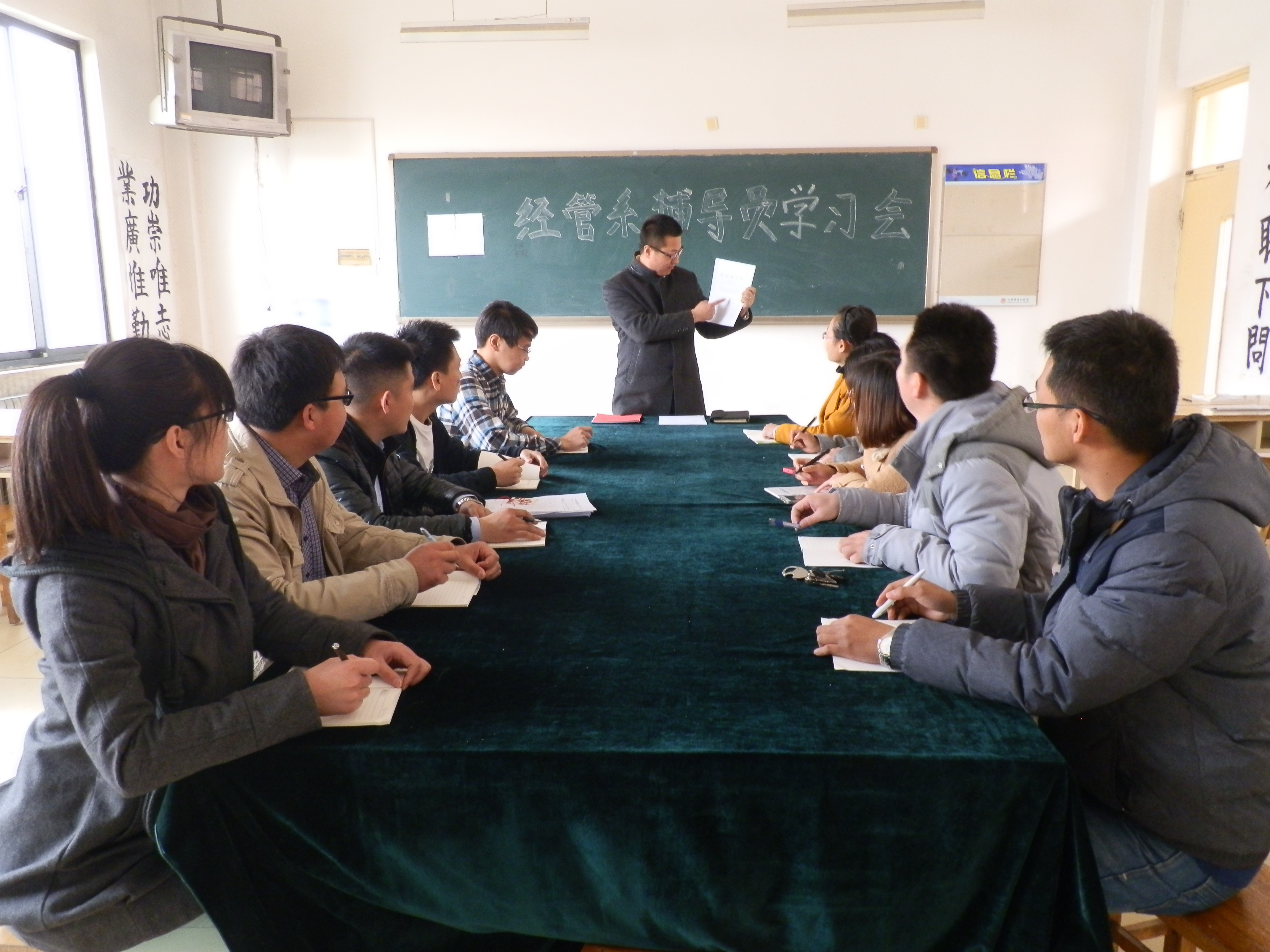 学习过程中范世伟主任带领大家学习了“《高校辅导员职业能力标准(暂行)》教思政[2014]2号”文件,全面学习了高校辅导员的九项职业能力,随后大家展开讨论,从我们的实际工作出发跟我们学习的辅导员职业能力内容相联系,发现我们能力的缺陷和工作的不足,同时讨论学习和自我提高的途径。