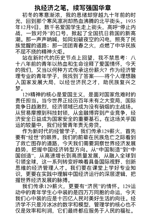 为深切缅怀“一二・九”运动中挺身而出的爱国青年,铭记热血沸腾的抗争历史,进一步激发团员青年的爱国情怀、使命意识与奋进精神,12月1日—11日永利开展了“传承一二・九薪火,争做经管强国青年”主题征文活动。