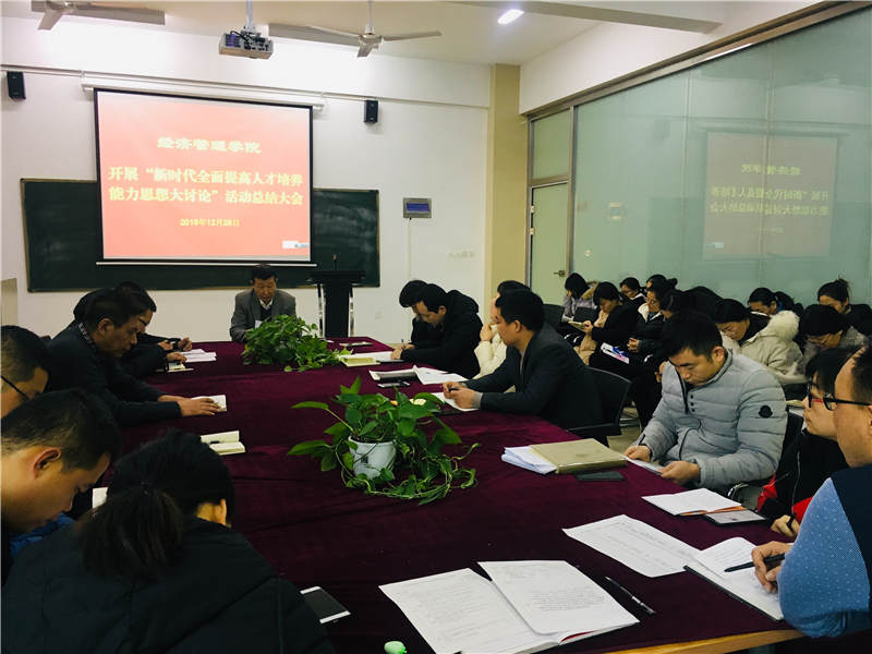 为认真落实教育部《关于加快建设高水平本科教育 全面提高人才培养能力的意见》(教高“2018”2号)文件精神和学校《2018年工作要点》要求,根据学校《关于开展新时代全面提高人才培养能力思想大讨论的通知》鲁华宇院校办字“2018”41 号文件要求,永利从11月1日至12月28日在全院范围内开展了“新时代全面提高人才培养能力思想大讨论”学习研讨活动。近日,思想大讨论活动总结大会在科学实验楼712举行,会议由院长于维同主持,经管学院全体教师参加了总结大会。
