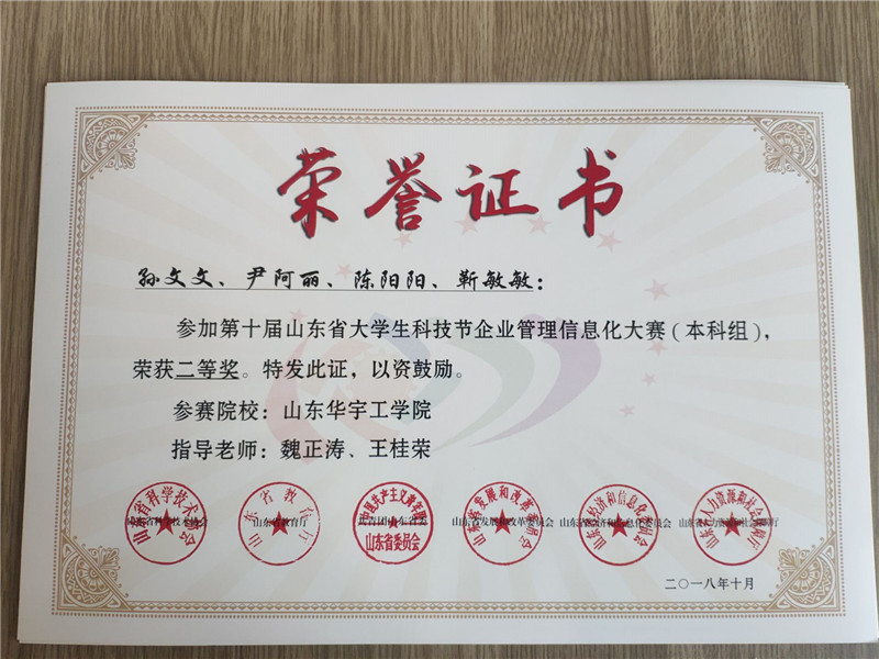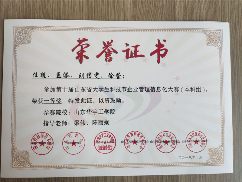 近日,由山东省教育厅、山东省科学技术协会、山东省发展和改革委员会、山东省经济和信息化委员会、中国共产主义青年团山东省委员会、山东省人力资源和社会保障厅共同举办的第十届山东省大学生科技节企业管理信息化大赛(本科组)在济南市山东财经大学燕山校区落下帷幕。永利学生刘传雯、徐莹、任聪、孟添(指导教师梁伟、陈丽娴)荣获本科组团体一等奖;尹阿丽、靳敏敏、陈阳阳、孙文文(指导教师魏正涛、王桂荣)荣获本科组团体二等奖。