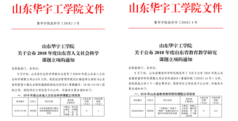 在获批项目中,生俊青老师主持的项目《山东省新旧动能转换背景下专利知识产权保护策略构建研究》(课题编号:2018RKA14002),成功立项山东省重点研发计划(软科学部分)项目,获得山东省科技厅经费支持0.3万元,学校配备研究资金3万元;刘红梅老师主持的《山东省创新型小微企业税收激励机制优化研究》(课题编号:18-ZC-JJ-02)成功立项山东省人文社会科学课题,获得学校经费资助1万元;管程程老师主持的《“互联网+”背景下“MOOC”资源在混合式教学中的研究和实践》(课题编号:2018JXY3014)成功立项度山东省教育教学研究课题,获得学校经费资助0.6万元;刘红梅老师主持的《加速鲁西北装备制造业发展的结构性减税问题研究》(课题编号:J18RA074)、刘旭老师主持的《云物流模式下的鲁西北地区生鲜农产品绿色供应链创新与实践研究》(课题编号:J18RA098)被列入山东省高等学校科研发展计划人文社科资助类项目,分别获得山东省教育厅经费资助0.5万元,学校经费资助0.5万元;魏正涛老师主持的《“中国制造2025”背景下山东制造业转型升级中财务问题研究》(课题编号:J18RB104)、李娟老师主持的《供给侧视角下山东农村种植业结构性调整对策研究》(课题编号:J18RB122)、范坤坤老师主持的《基于互联网思维的PPP项目一体化监管与服务平台研究》(课题编号:J18RB077)3项被列入山东省高等学校科研发展人文社科项目自筹经费计划,获得学校经费资助0.6万元。