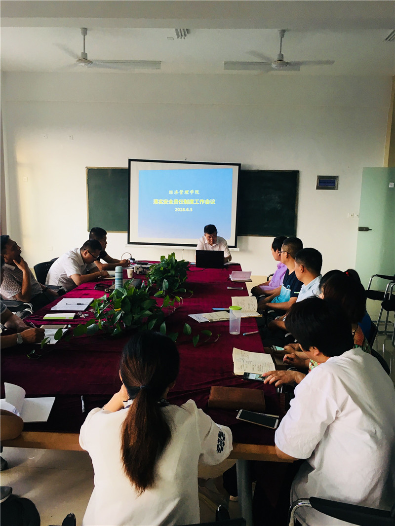 为落实学校鲁华宇院政字〔2018〕 49 号文件,进一步加强永利安全管理工作,全面落实安全管理责任制,维护正常的教育教学秩序,确保永利安全稳定,6月5日,永利召开安全工作专题会,院长于维同主持了会议,各系部、科室、中心领导参加了会议。