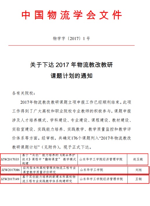 永利获批立项的项目分别是:赵玉娥老师主持的《基于“双创”能力培养的〈商品养护技术〉课程中“翻转课堂” 教学模式构建》(课题编号:JZW2017035)、刘旭老师主持的《应用型本科高校管理类物流工程专业课堂教学质量评价研究》(课题编号:JZW2017086)、王钢老师主持的《基于双创能力培养的新建本科高校物流工程专业实践教学体系构建研究》(课题编号:JZW2017149)。
